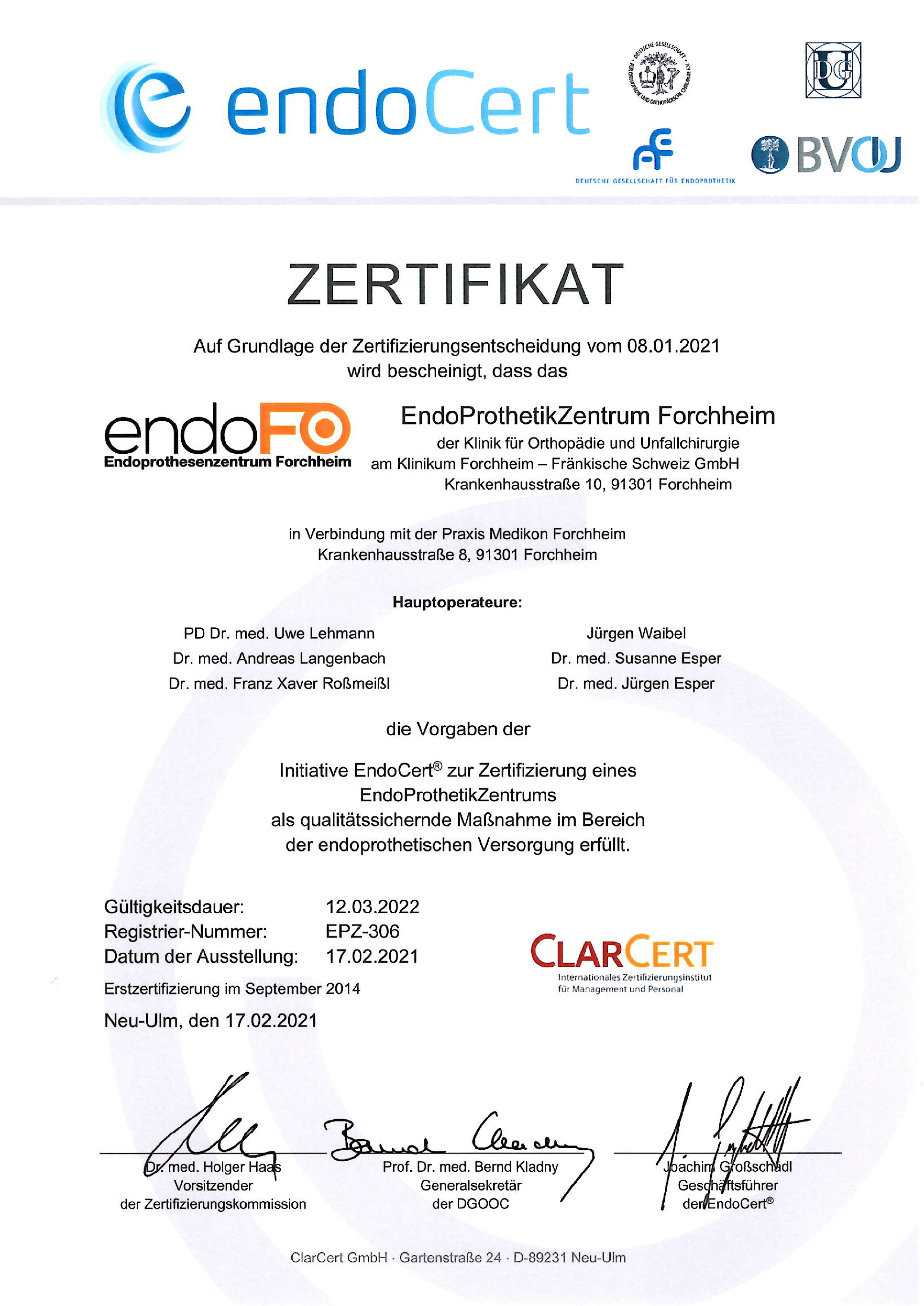 Das Endoprothetik Zentrum des Klinikum Forchheim ist mit seinen Hauptoperateuren Dr. med. Susanne Esper und Dr. med Jürgen Esper mit der endoCert Zertifizierung ausgezeichnet. Eine externe Fachgesellschaft prüft die hohe Versorgungsqualität und kontinuierliche Erfahrung im Bereich des Hüft- und Kniegelenkersatzes – so können Sie sich auf eine maximale Behandlungsqualität für Ihren bevorstehenden Eingriff verlassen.